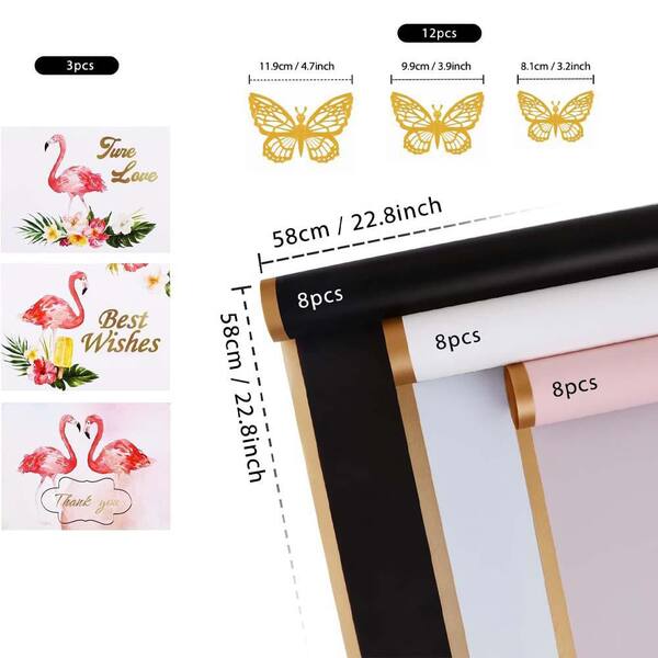 Waterproof Floral Wrapping Paper Set with 3D Gold Butterfly Decor Black White Pink 24 Sheets Florist Supplies