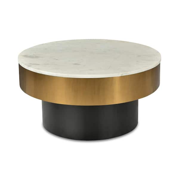 Koa 31.5 in. Round White Marble Coffee Table with Brass Rim and Metal Base