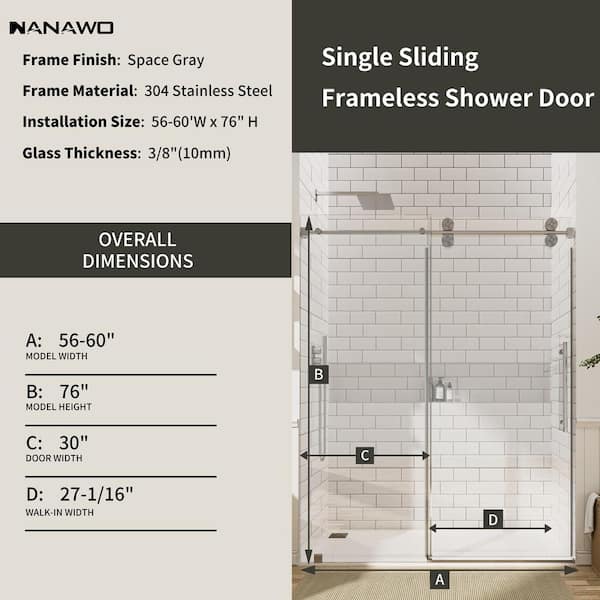 60 in. W x 76 in. H Single Sliding Frameless Shower Door in Grey with 3/8 in. Clear Glass