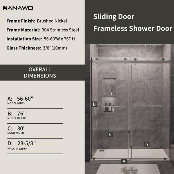 60 in. W x 76 in. H Sliding Frameless Shower Door in Brushed Nickel with 3/8 in. Clear Glass