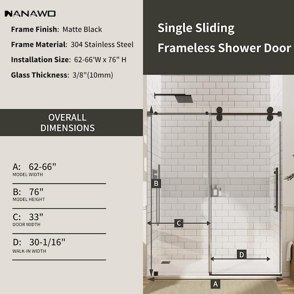 66 in. W x 76 in. H Single Sliding Frameless Shower Door in Matte Black with 3/8 in. Clear Glass