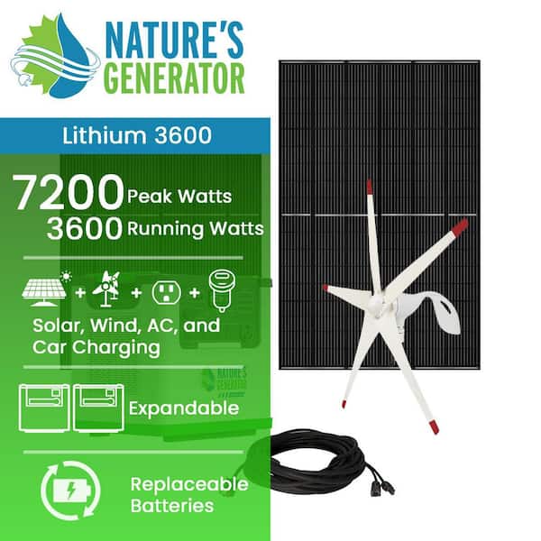 Lithium 3600-Watt Continuous/7200 Peak Push Button Start Solar & Wind Generator with 2 410-Watt Panels and Wind Turbine