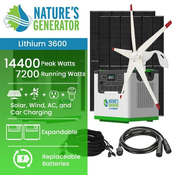 Lithium 7200 Watt Continuous / 14400 Watt Peak Solar Generators with 4 100W Solar Panels and Wind Turbine