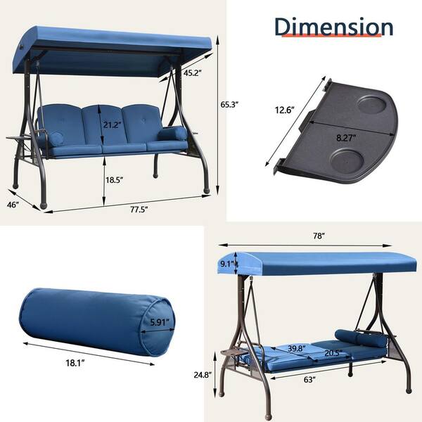3-Seat Outdoor Metal Patio Swing with Canopy and 2 Foldable Side Trays, Cushions and Pillows, Blue