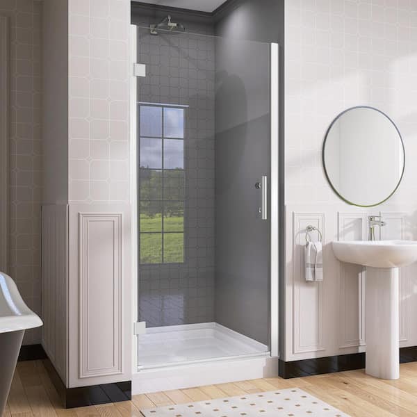 34 to 35.25 in. W x 72 in. H Left Hinged Frameless Pivot Swing Shower Door Polished Chrome with Clear Glass and Handle