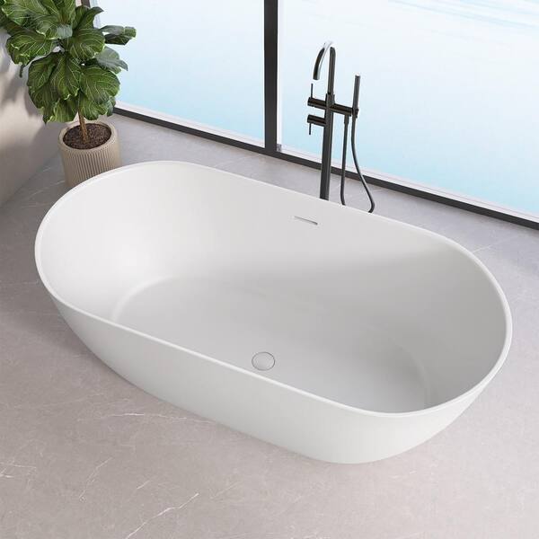 59 in. x 29.5 in. Solid Surface Soaking Bathtub with Center Drain Flat Bottom Free Standing Artificial Stone Tub White