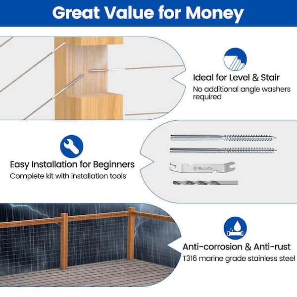 1/8 in. Stainless Steel Cable Railing Hardware Kit Left and Right Handed Thread for Wood Post, Silver (10-Pack)