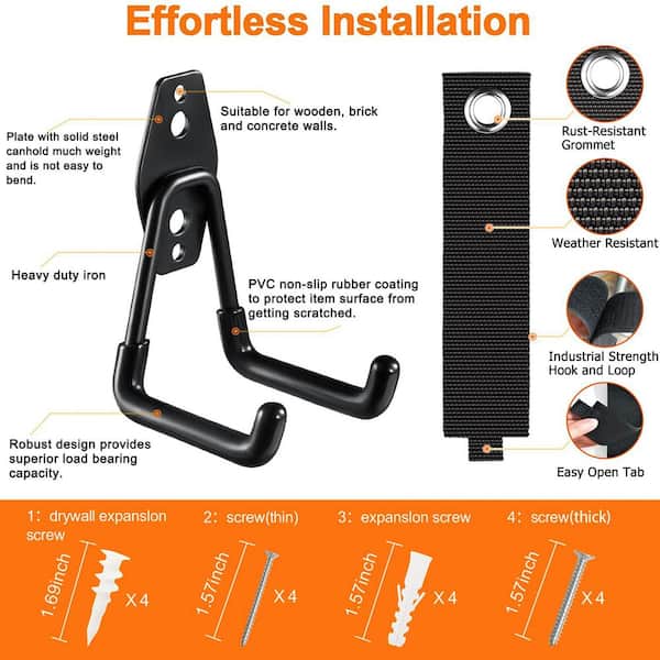 7.7 in. U Shaped Garage Long Hooks with 2 Extension Cord Holder Organizer for Garden Tool Bikes Hanging, Black (4-Pack)