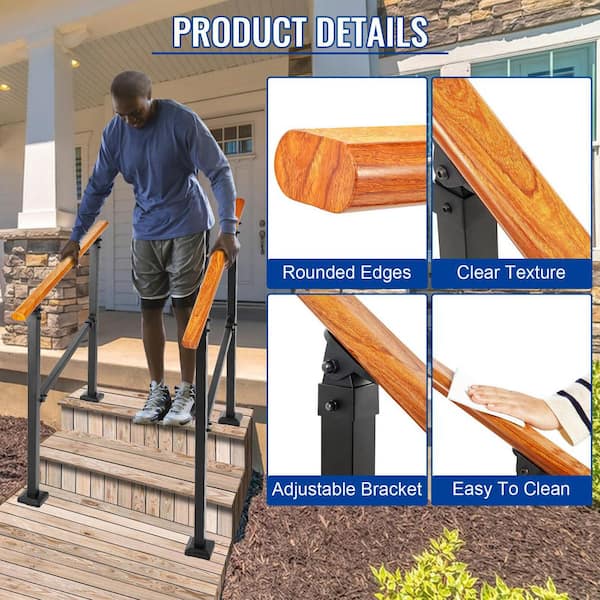 Outdoor Steel Metal Hand Rails for Porch, Wooden Stairs Railing Fit 1 to 3 Steps with Installation Kit, Black