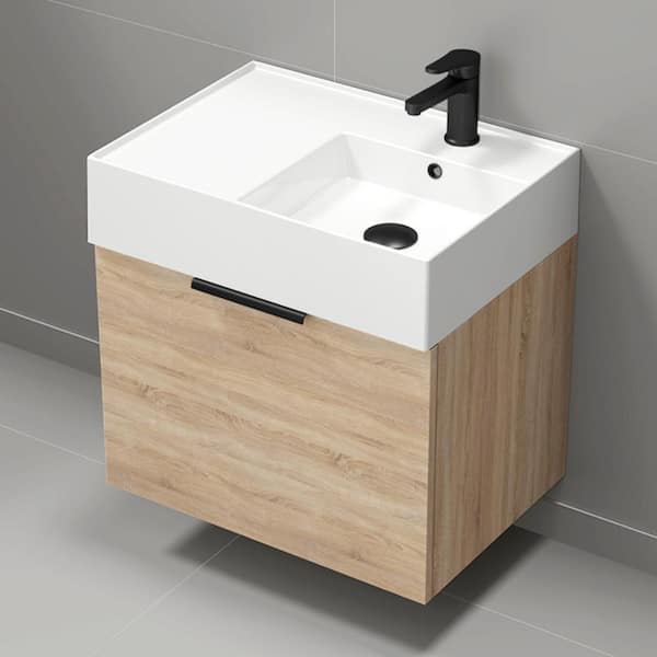 Derin 23.6 in. W x 17.3 in. D x 25.19 in. H Modern Bathroom Vanity in Brown Oak With White Ceramic Top