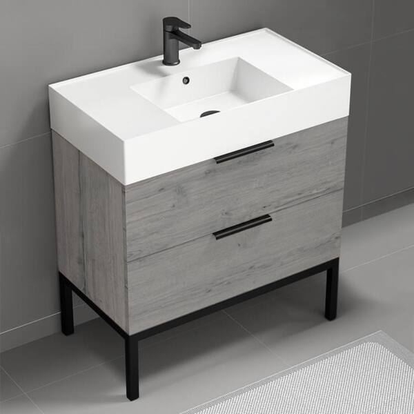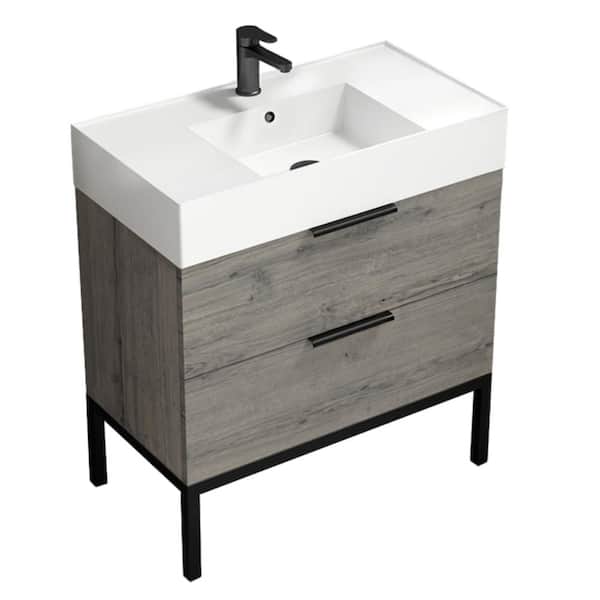 Derin 31.89 in. W x 17.32 in. D x 34.65 in. H Modern Bathroom Vanity in Grey Oak With White Ceramic Top
