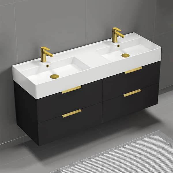 Derin 55.51 in. W x 18.11 in. D x 25.2 H Double Sinks Wall Mounted Bathroom Vanity in Matte Black with White Ceramic Top