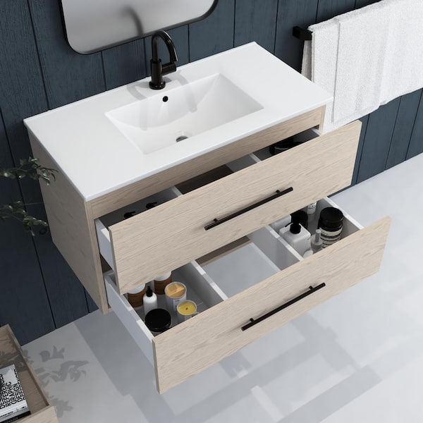 Napa 32 in. W. x 18 in. D Single Sink Bathroom Vanity Wall Mounted in Natural Oak with Ceramic Integrated Countertop