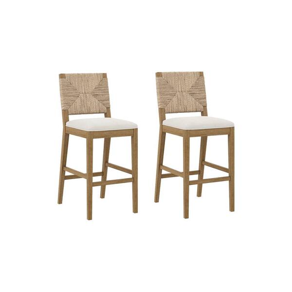 Beacon 29 in. Bohemian Boucle Upholstered Wood Bar Height Bar Stool w/Woven Back, Cream Boucle/Light Brown, Set of 2