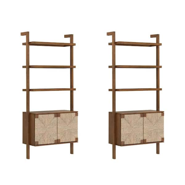 Beacon 72 in. Tall Dark Brown Solid Wood 3-Shelf Boho Bookcase with Seagrass Cabinet, (Set of 2)