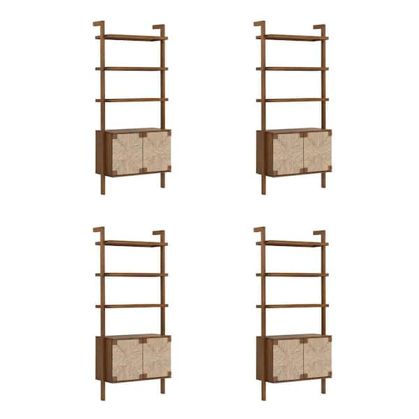 Beacon 72 in. Tall Dark Brown Solid Wood 3-Shelf Boho Bookcase with Seagrass Cabinet, (Set of 4)