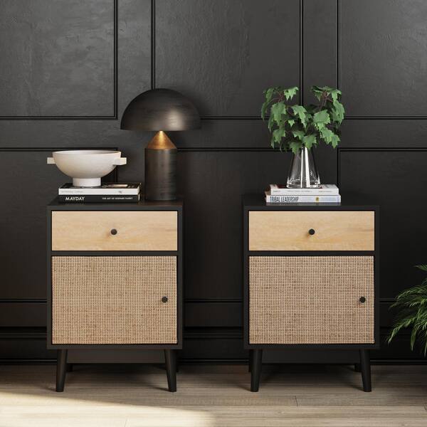 Bonnie 16 in. Black Oak End Side Table Storage Drawer and Rattan Door for Living Room Nightstand Bedroom (Set of 2)