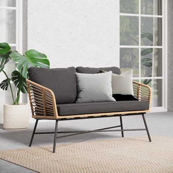 Flow Bohemian Rattan Wicker Upholstered Outdoor Loveseat Sofa for Porch or Patio with Dark Gray Cushions