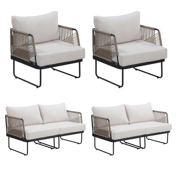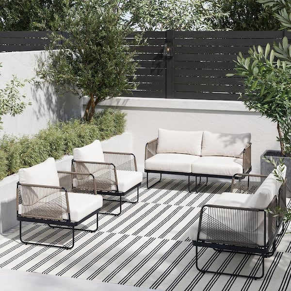 Isla Bohemian 4-Piece Conversation Patio Set, Metal Outdoor Loveseat and Chair Set with White Cream Cushions