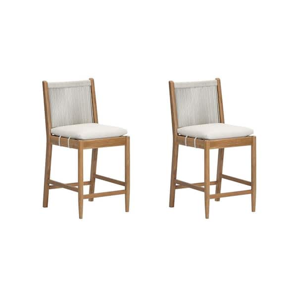 Kayden Light Brown Solid Wood Outdoor Bar Stool Counter Height with Light Gray Cushion and Woven Rope Backrest 2-Pack