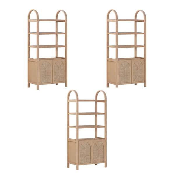 Leah 71 in. Tall Seagrass Raw Oak Solid Wood 3-Shelf Bookcase Cabinet with Arched Frame & Seagrass Doors, Set of 3