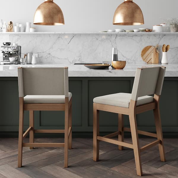 Linus 36 in. Modern Upholstered Counter Height Bar Stool with Back and Solid Wood Legs, Natural Flax/Brown, Set of 2