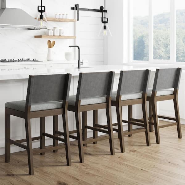 Linus 36 in. Modern Wood Counter Height Bar Stool with Faux Leather Back and Ivory Upholstered Fabric Seat, Set of 4