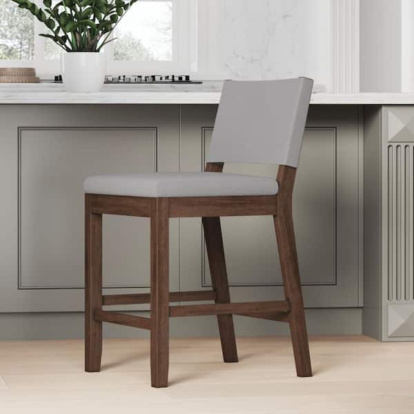 Linus Modern Upholstered Counter Height Bar Stool with Back and Solid Rubberwood Legs in a Wire-Brushed Brown Finish