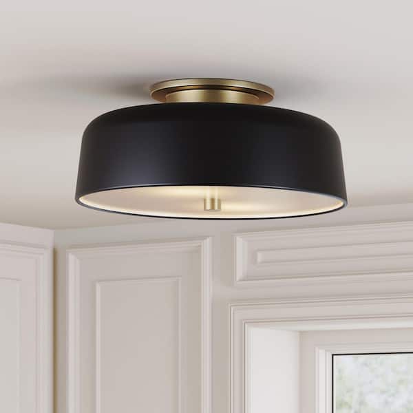 McKay 12.1 in. 2-Light Matte Black Mid-Century Modern Flush Mount Ceiling Light with Metal Shade and Glass Diffuser