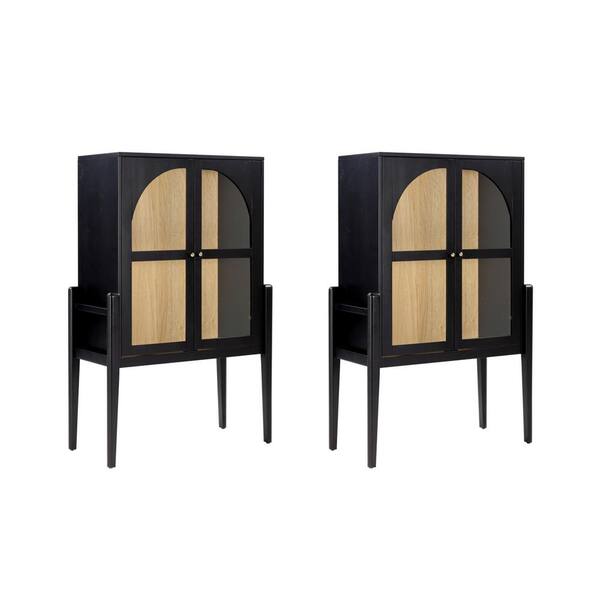 Shadow Matte Black MDF 35 in. Sideboard Credenza with Tempered Glass Doors and Light Oak Interior, Set of 2