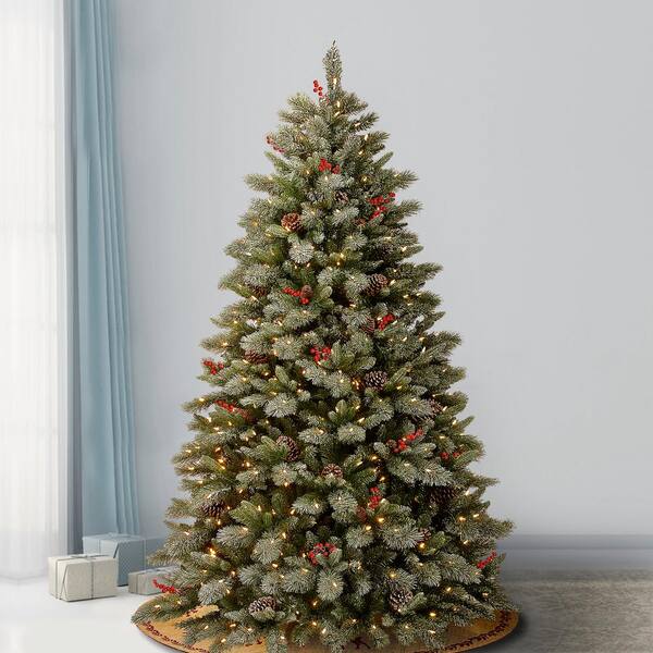 7-1/2 ft. Feel Real Snowy Bristle Berry Hinged Tree with Red Berries, Mixed Cones and 700 Dual Color LED Lights and Pow