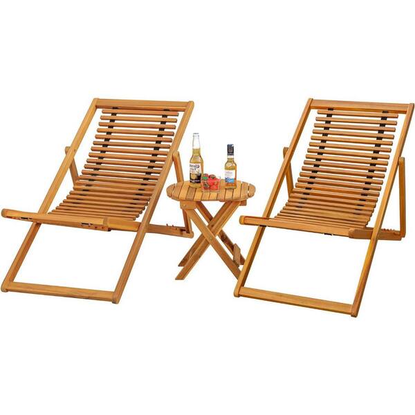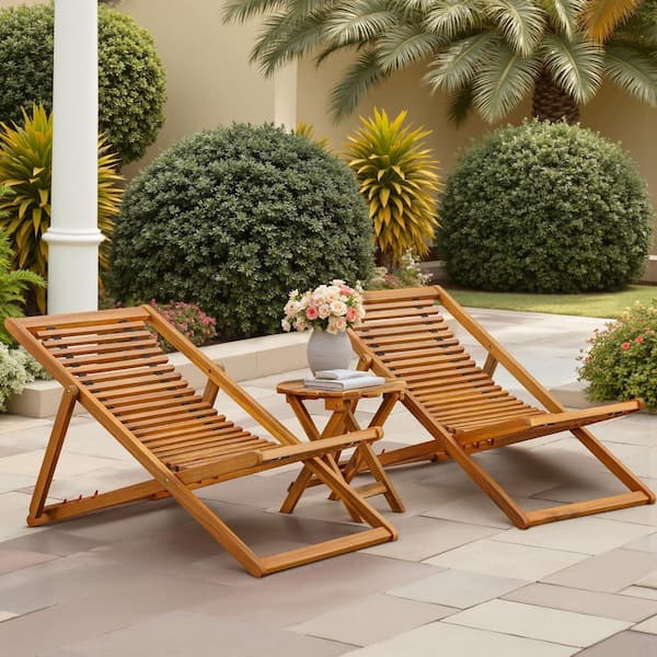 Natural 3-Piece Wood Foldable Outdoor Chaise Lounge with Side Table