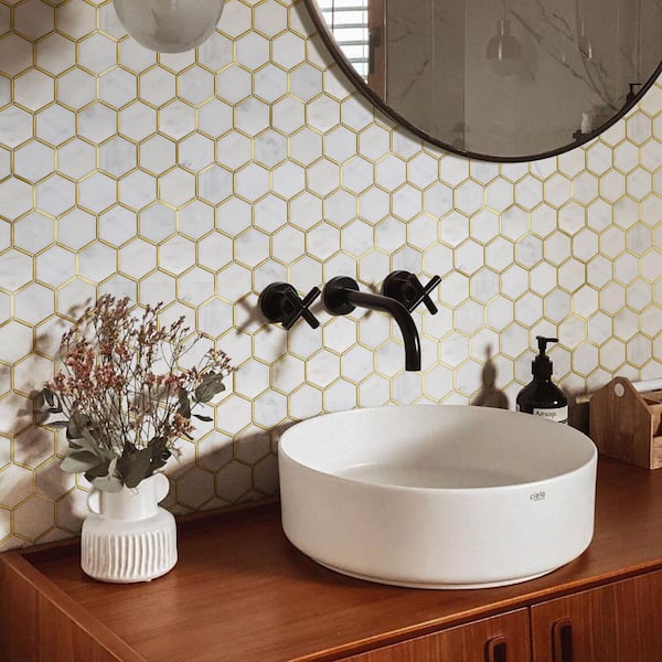 Natural Blanco White Gold 12.8 in. x 11.11 in. Honeycomb Polished Marble Mosaic Tile Sample