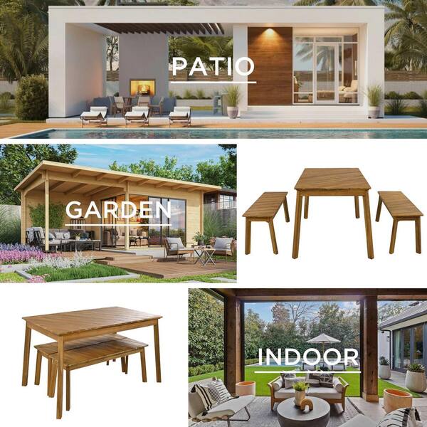 Natural Brown 3-Piece Acacia Wood Outdoor Dining Set, With 2 Benches and Picnic Beer Table
