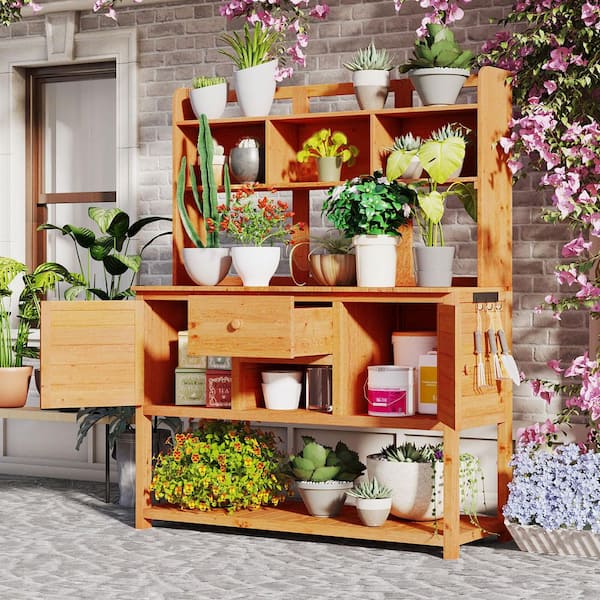Natural Solid Wood Potting Bench Garden Workstation with Hutch, Drawer and Adjustable Shelves