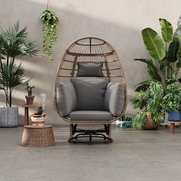 Natural Wicker Outdoor Rocking Chair 360° Swivel Chair Balcony Poolside Egg Chair with Rocking Function, Gray Cushion