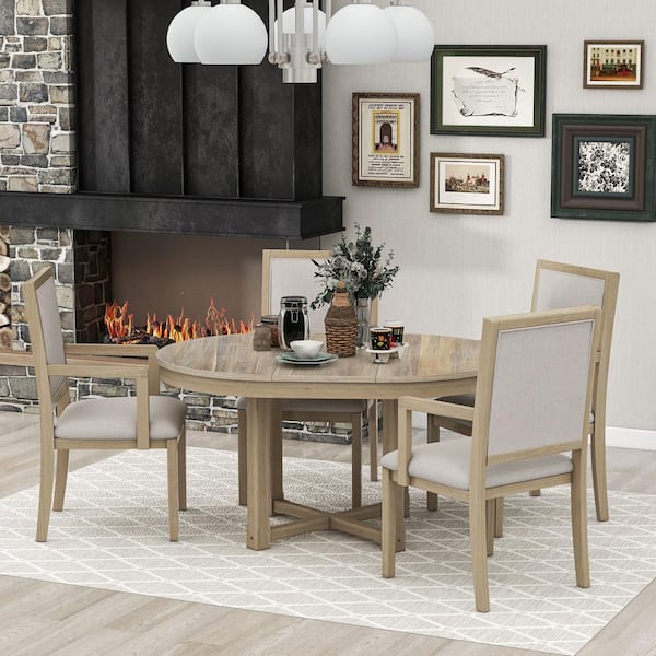 Natural Wood Wash 5-Piece Wood Outdoor Dining Set with Beige Cushion