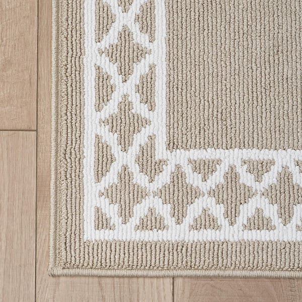 Washable Skid Resistant Beige /White 2.6 ft. x 12 ft. All Loop Tufted Area Rug
