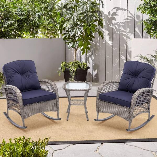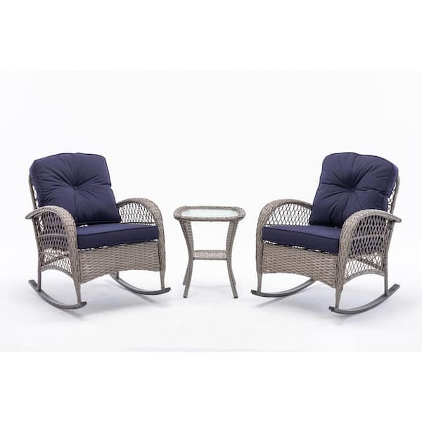 Navy Blue 3-Piece Wicker Outdoor Patio Conversation Set with Cushions