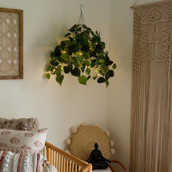 24 in. UV Resistant Artificial Philodendron Vine with 50 Warm White LED Lights in White Hanging Basket (Indoor/Outdoor)