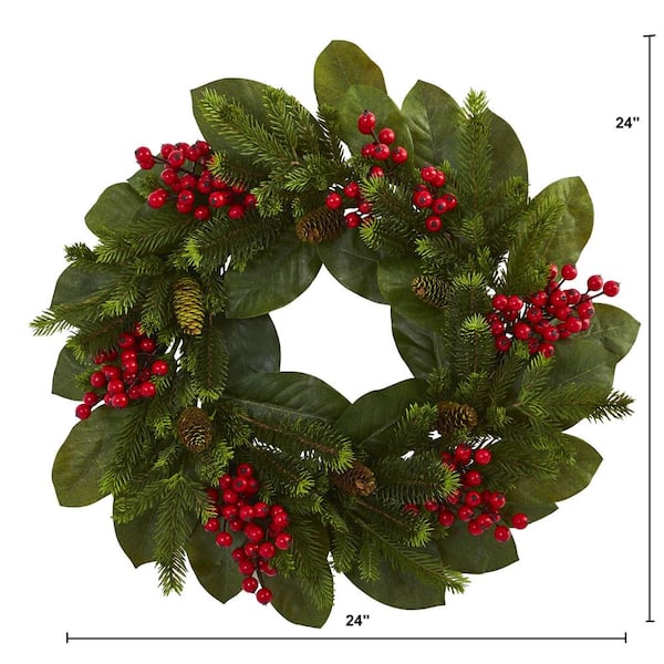 24in. Artificial Unlit Artificial Holiday Wreath with Magnolia Leaf, Berry and Pine