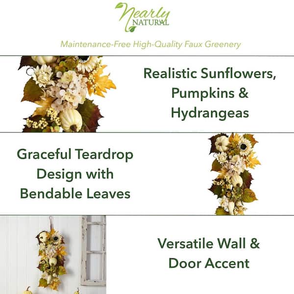 33 in. Green Fall Sunflower, Hydrangea and White Pumpkin Artificial Autumn Teardrop