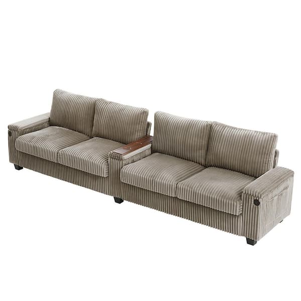 133 in. Square Arms Corduroy Rectangle Sofa in. Brown with USB Ports and Hidden Storage Arms