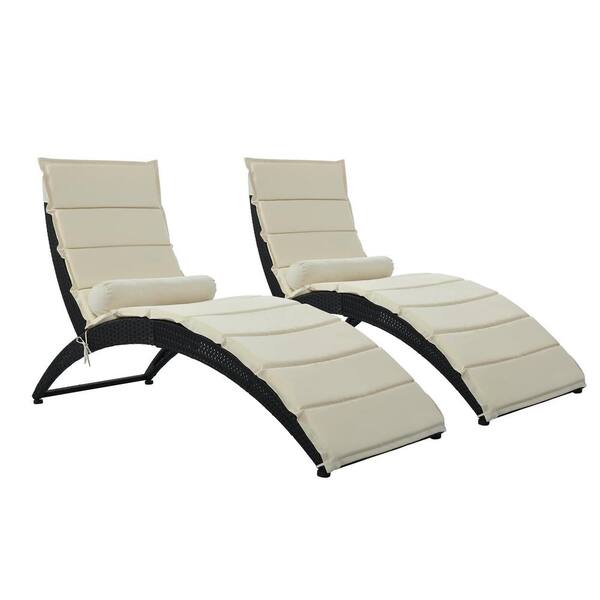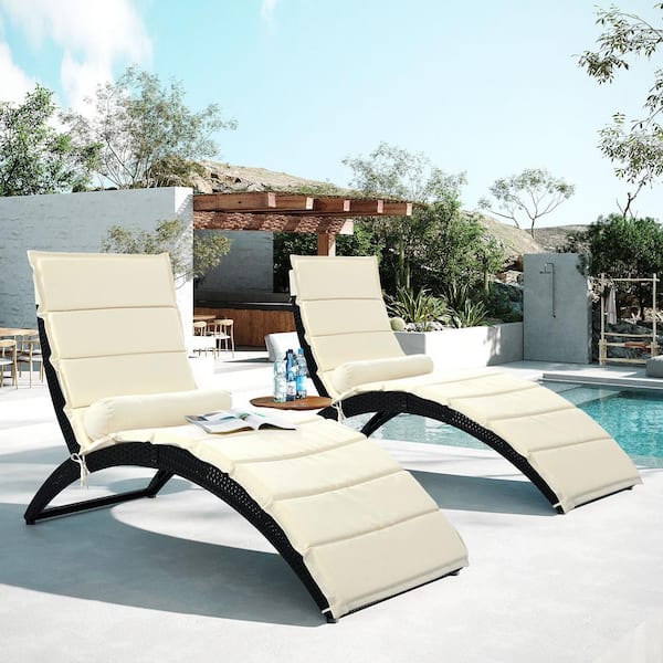 2-Piece Foldable Wicker Outdoor Chaise Lounge with Bolster Pillow and Removable Beige Cushion