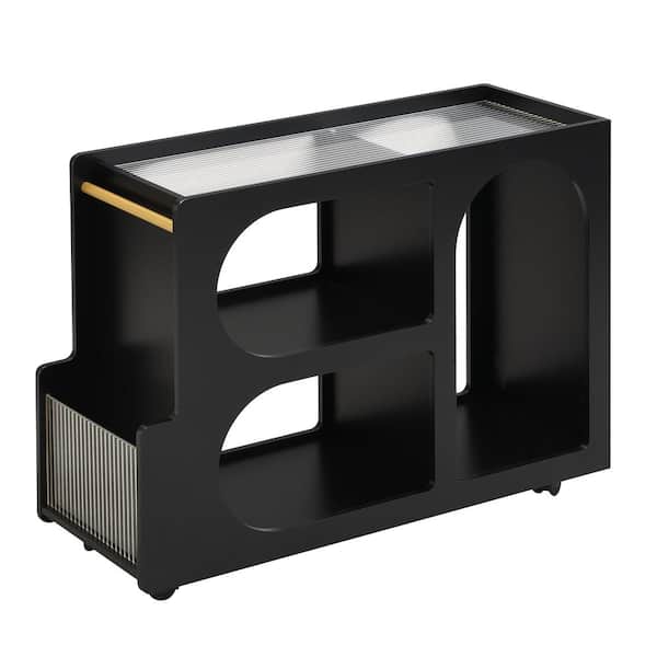 31.5 in. Black Rectangle Glass End Table with Lockable Wheels with 5mm Thick Fluted Tempered Glass