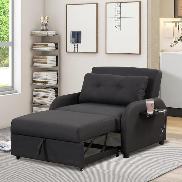 42.9 in. Black Linen 2-Seater Size Pull Out Sofa Bed with 2 Wing Table and USB Charge