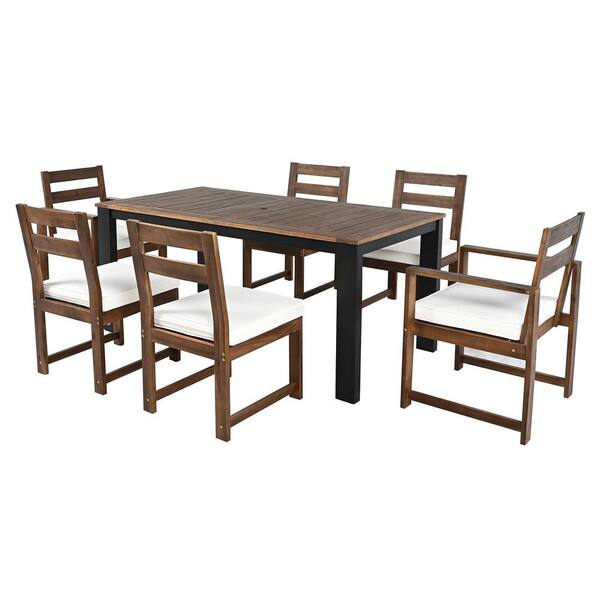 7-Piece Wood Patio Outdoor Dining Set with Beige Cushions