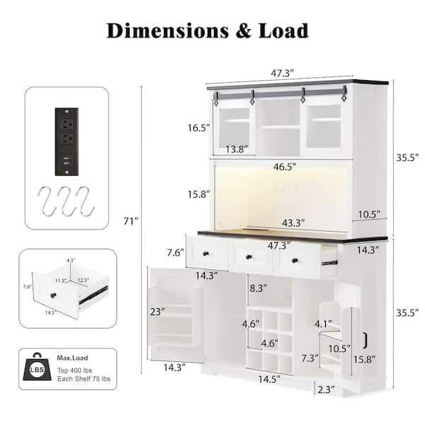 71 in. White Oak Pantry Storage Cabinet with Hutch, Sliding Door, Power Outlet, Pegboard, Rack and 3-Drawers