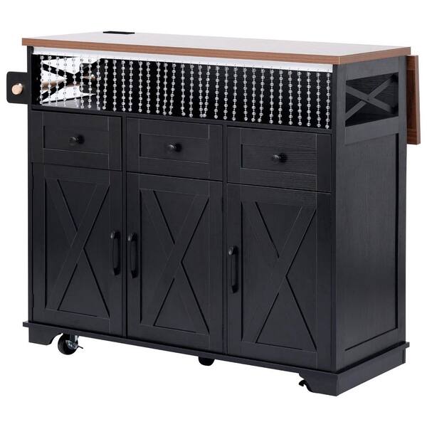 Black Wood 46.5 in. Rolling Kitchen Island with Drop Leaf, Power Outlet and 5-Wheels