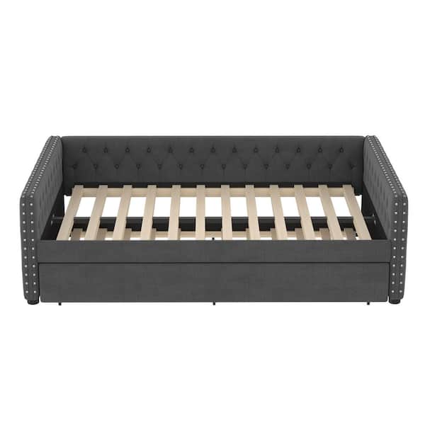 Gray Full Size Daybed with Trundle and Button and Copper Nail on Square Arms